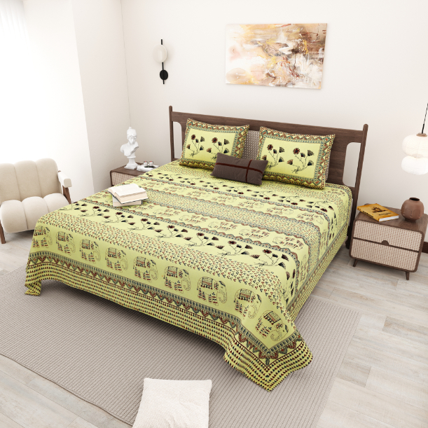 Cotton Printed Tulsi Theme Double Bedsheet with Pillow Covers