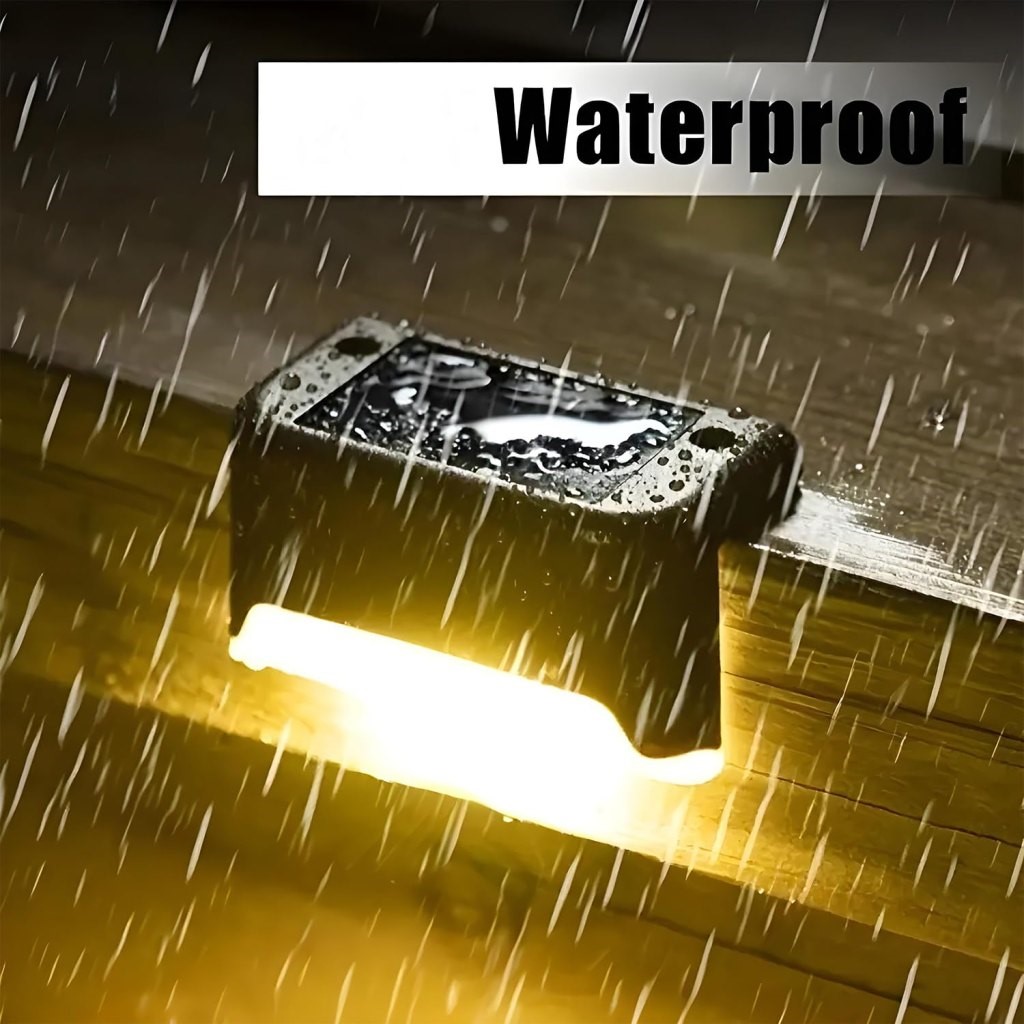 Waterproof LED Step Lights, designed to provide warm white illumination for your deck, patio, driveway, fence, stairs, and garden pathway. These energy-efficient lights are powered by solar energy, automatically charging during the day and lighting up at night, ensuring hassle-free operation without the need for wiring or electricity.